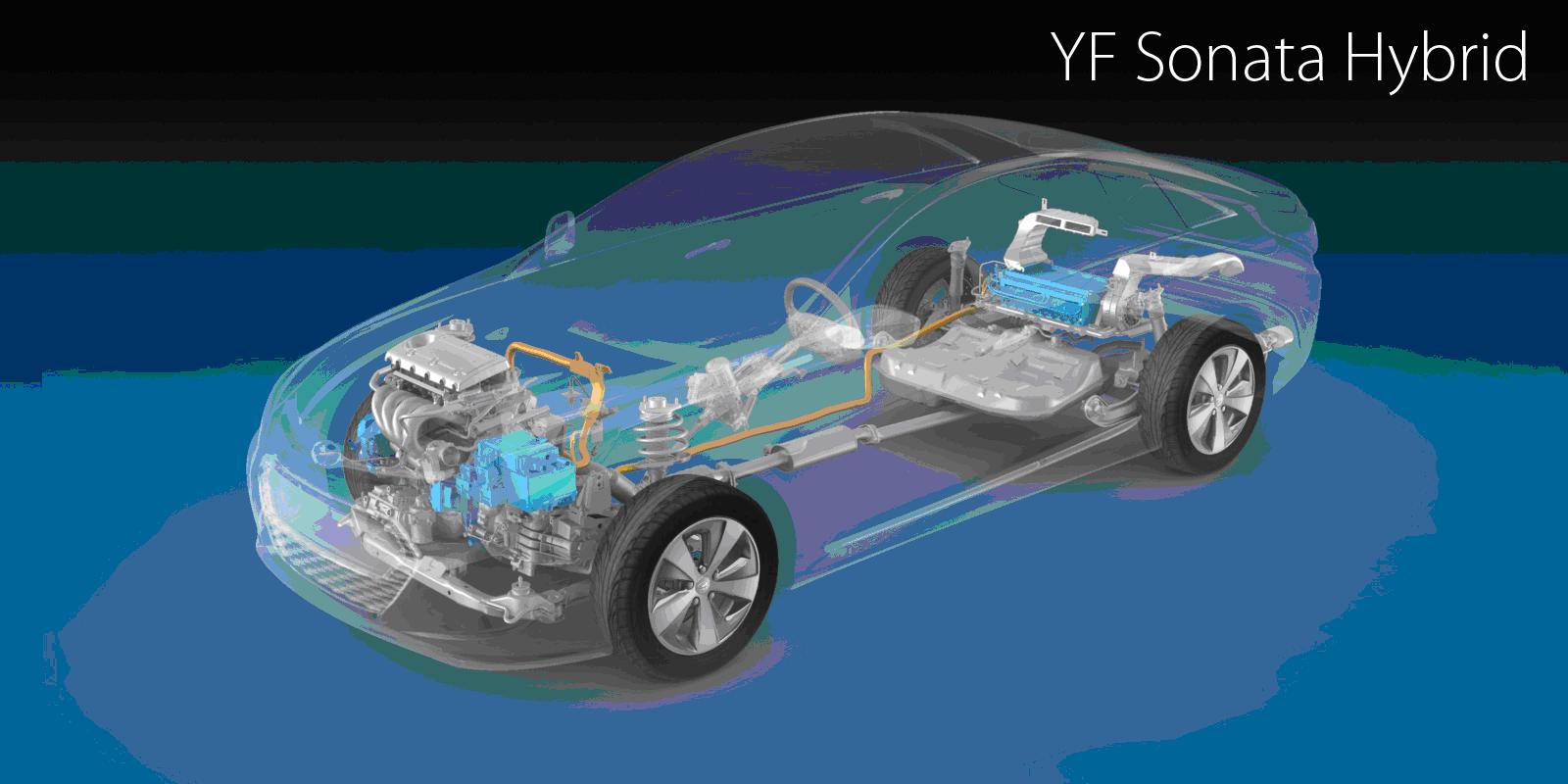 HYUNDAI’S HYBRID BLUE DRIVE ARCHITECTUREHyundai’s Hybrid Blue Drive is a proprietary parallel hybrid drive system that runs on the already fuel-efficient 2.4-liter Theta II engine (169 horsepower at 6,000 rpm and 156 lb-ft of torque at 4,500 rpm) mated to a 6-speed automatic transmission and a 30kW (151 lb-ft) electric motor for maximum fuel economy. Hyundai’s Hybrid Blue Drive has an all-electric mode and a parallel drive mode. This means the wheels are turned by power coming directly from the gasoline engine, or the electric motor, or both together, as conditions demand. This parallel hybrid drive architecture will serve as the foundation for future hybrid drive vehicles to be developed by Hyundai.