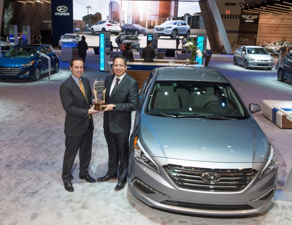 Left to Right: Steve Lind, executive vice president, operations, Cox Automotive Media, presents Brandon Ramirez, senior group manager, product planning, Hyundai Motor America, the trophy for Hyundai as the overall brand winner in the 2016 Kelley Blue Book 5-Year Cost to Own Awards at the 2016 Chicago Auto Show.