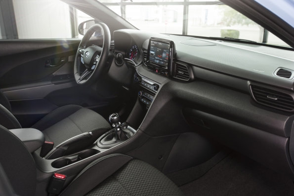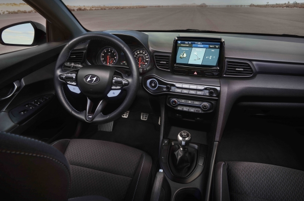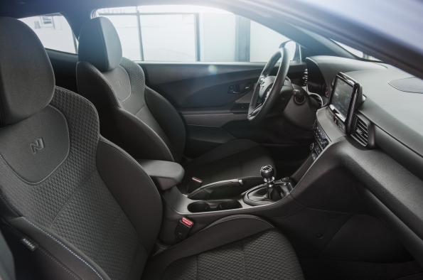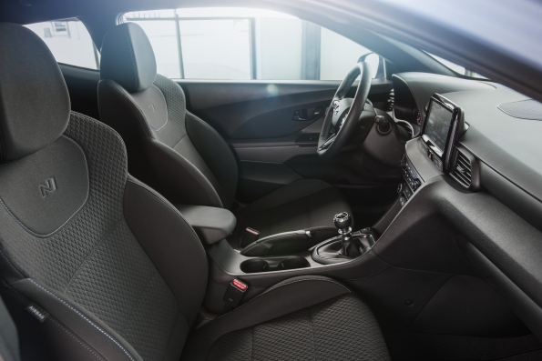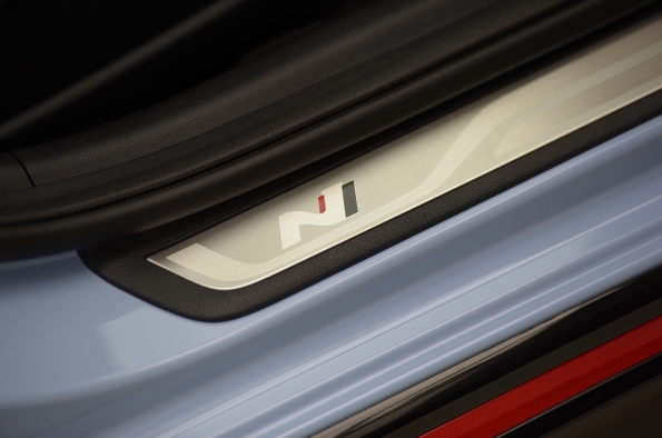 N INTERIOR DESIGNOn the inside, Veloster N offers exclusive N-design front cloth sport seats with performance-focused bolstering, N-design steering wheel, shift knob, N-logo door sill plates, and N-design electroluminescent instrument cluster. Interior details are accented by an N performance blue accent theme. As engine speed approaches redline, the N-design center cluster displays a progressive sequential shift indicator, alerting the driver of an impending shift point for maximum acceleration. N-brand metallic door sill scuff plates greet the driver as they approach the driver seat.